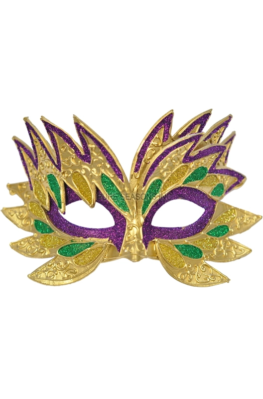 Fiery Angel Mardi Gras Mask (Purple) features a bold design emblazoned with swirls and bright glitter for a look that is festive and fun! This stunning mask is sure to make a statement at your Mardi Gras party!