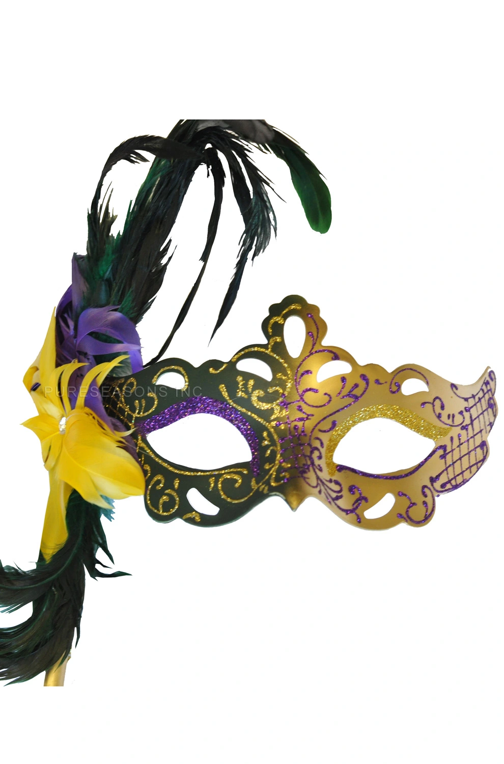 Flirty Feathers Mardi Gras Stick Mask (Green) brings Mardi Gras to life! Featuring a vibrant gold, green and purple theme, this half mask includes glitter decorations, flowers, feathers, and stick with a lovely green tassle. There’s no doubt that this flirty stick mask has all the embellishments needed to make New Orleans notice you!