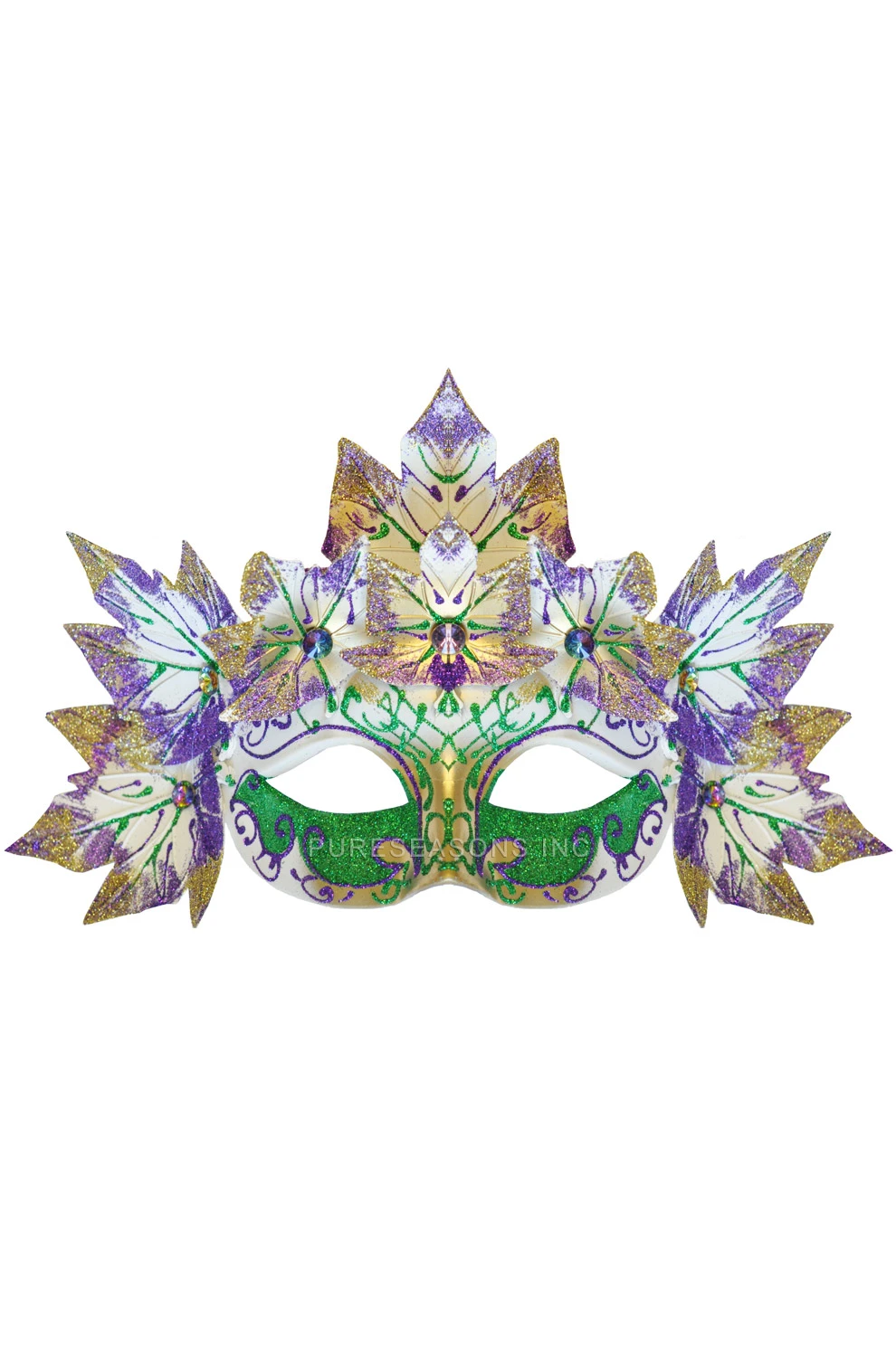 Gaia Mardi Gras Mask (White) features an elaborate paper mache half mask with detailed leaf embellishments all around. Mask also includes ribbon ties for comfortable wear. Inspired by the traditional Mardi Gras colors, this mask lets you commune with mother nature and earth in a way no other costume has before.
