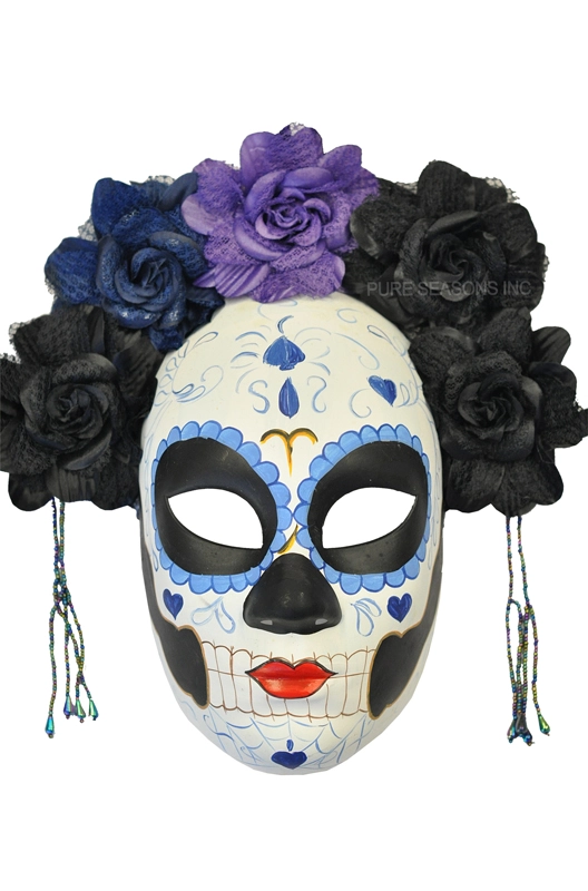 La Calavera Catrina Masquerade Mask (Black/Blue) features a full face skeleton mask decorated like a traditional sugar skull with a halo of flowers for a look that is perfect for your Day of the Dead celebration.