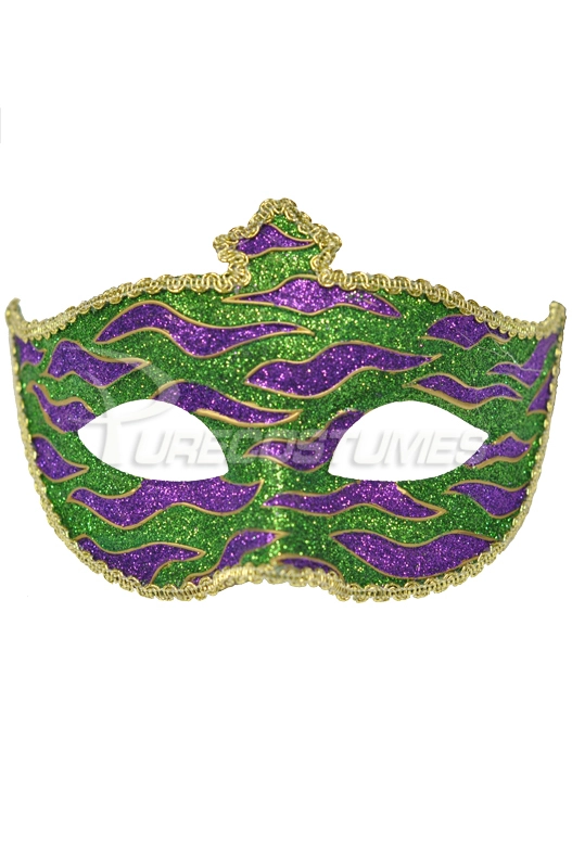 Mardi Gras Animal Print Adult Mask (Green) includes half mask with gold trim, purple, gold, and green glitter, and black ribbon ties for comfortable wear.
