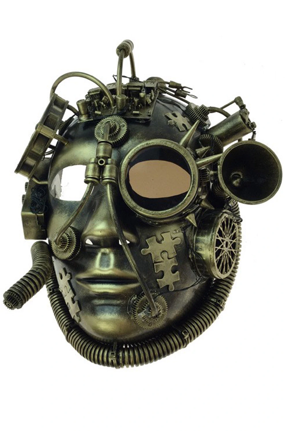 This mask looks as if it’s been created for an inventor, alchemist, or mad scientist. Featuring gears, wires, piping, and goggles, it’s a mask straight out of your wildest Steampunk fantasies!